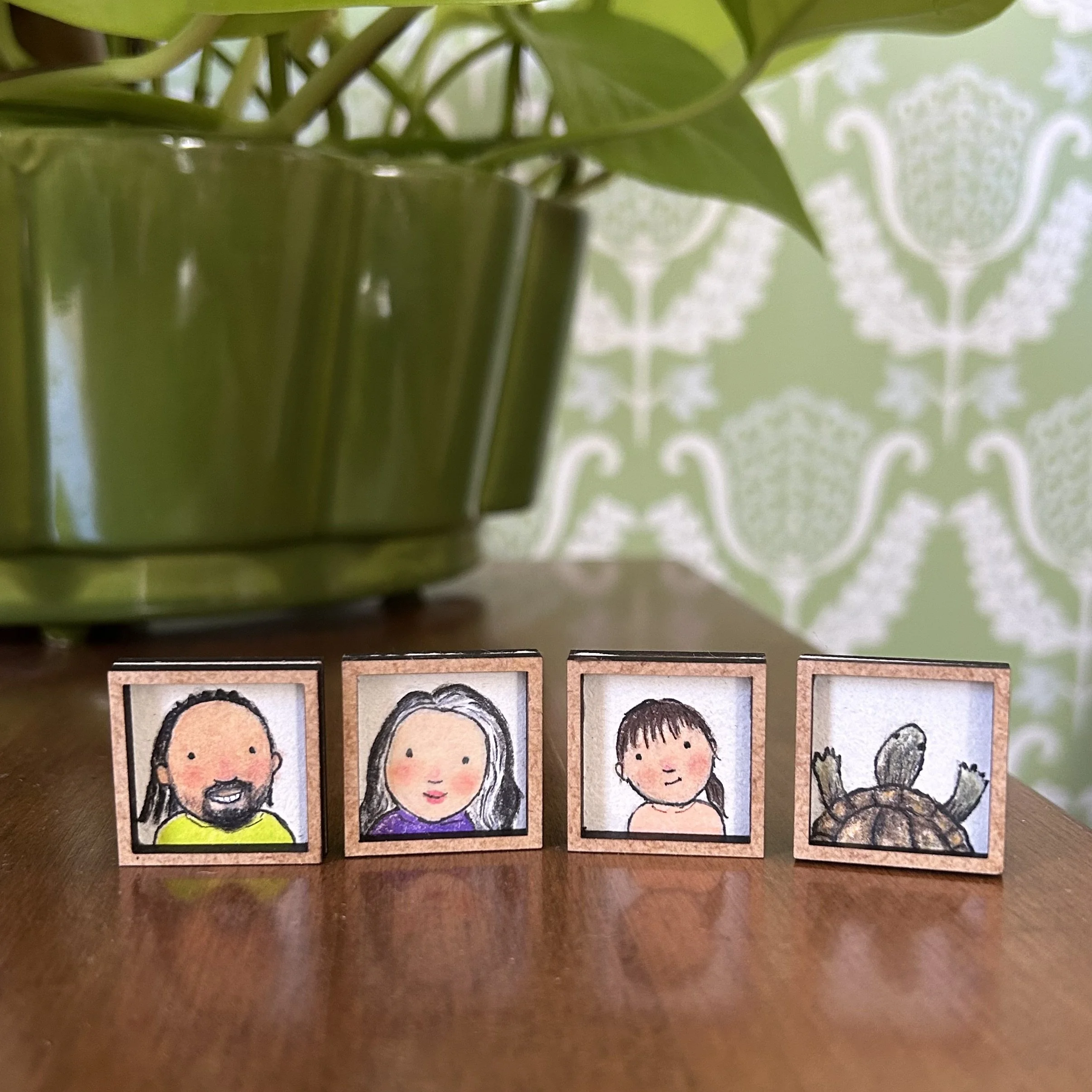 Each teeny tiny portrait is of one subject shown from the chest up. It can be of pets or people.